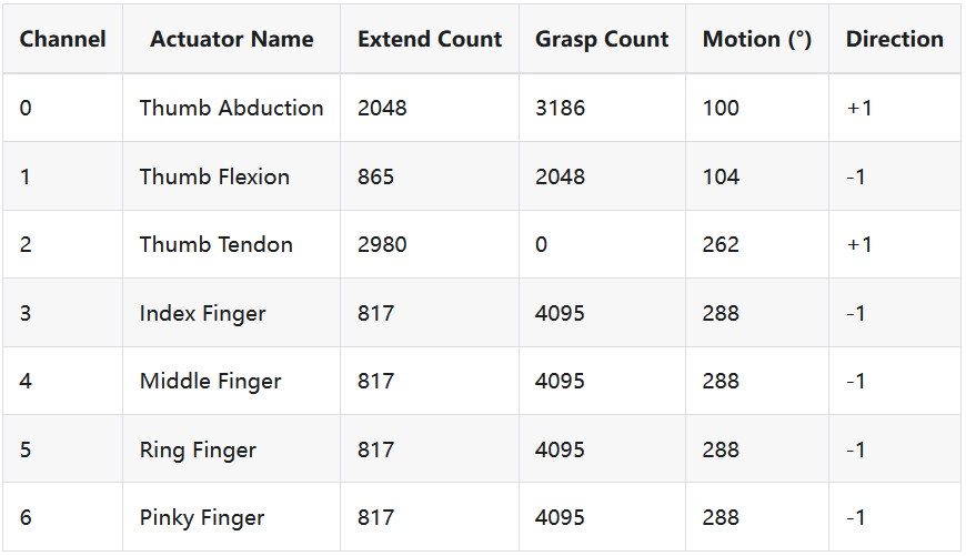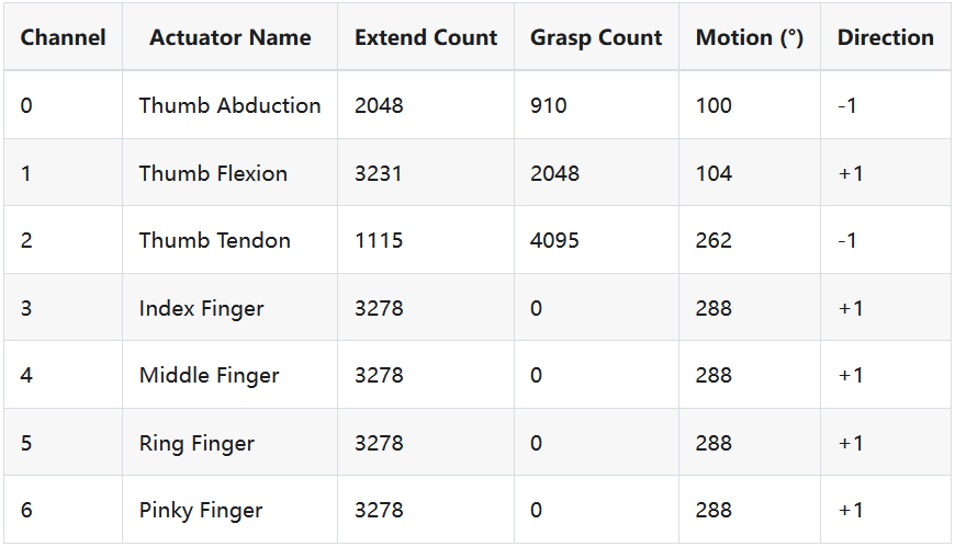 频道映射(从上到下): thumb_abduction_actuator拇指外展执行器, thumb_flex_actuator拇指屈曲执行器, thumb_tendon_actuator拇指肌腱执行器, index_finger_actuator食指执行器, middle_finger_actuator中指执行器, ring_finger_actuator无名指执行器, pinky_finger_actuator小指执行器.
